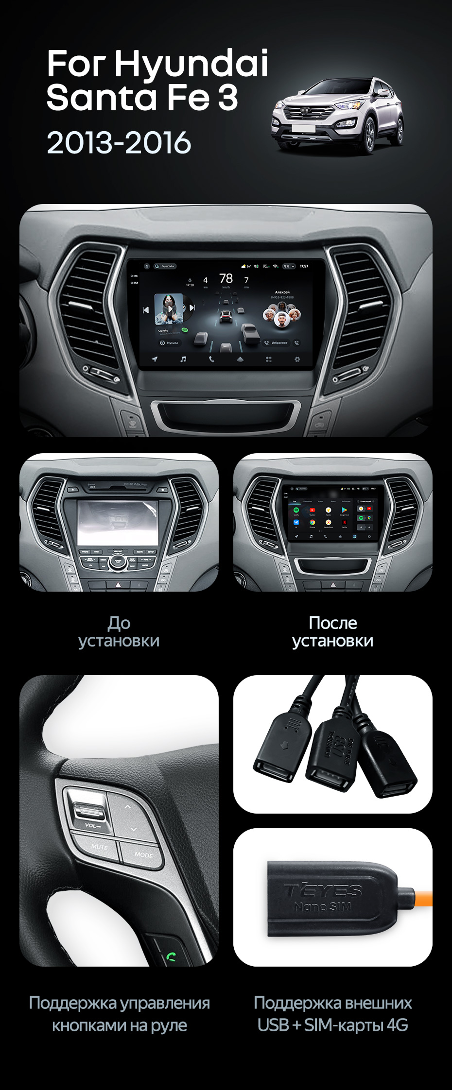 Штатная магнитола Teyes CC4 Pro 8/128 Hyundai Santa Fe 3 (2013-2016) Тип-A - купить всего за 58 250 руб. в интернет-магазине в Белгороде Teyes.com.ru. ✓ Самый лучший выбор мультимедиа ✓ Лучшая замена штатному ГУ ✓ Тел. +7 (800) 775-31-74