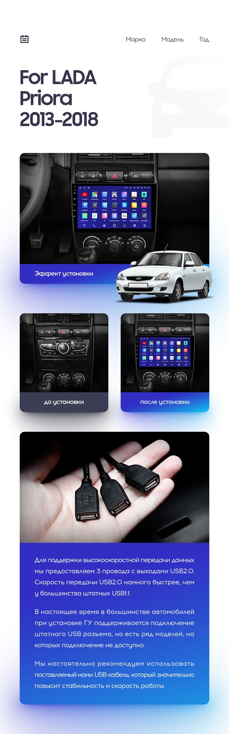 Полный комплект установки магнитолы Teyes с рамкой и проводкой можно выбрать в каталоге штатных магнитол LADA Priora (2013-2018).