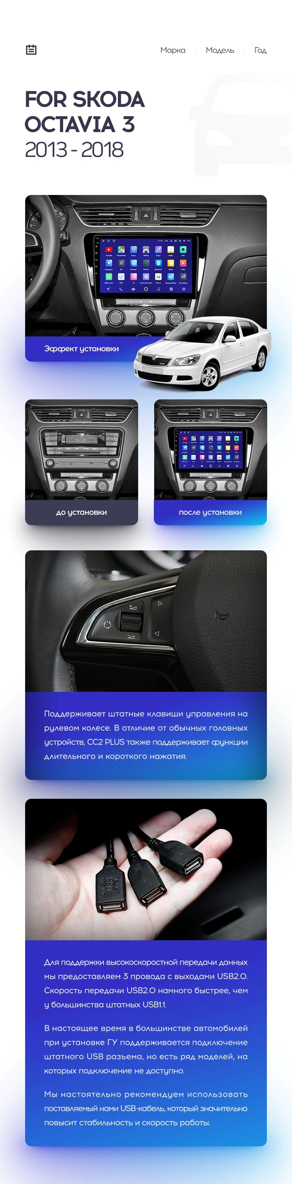 Полный комплект установки магнитолы Teyes с рамкой и проводкой можно выбрать в каталоге штатных магнитол Skoda Octavia 3 A7 (2013-2018).