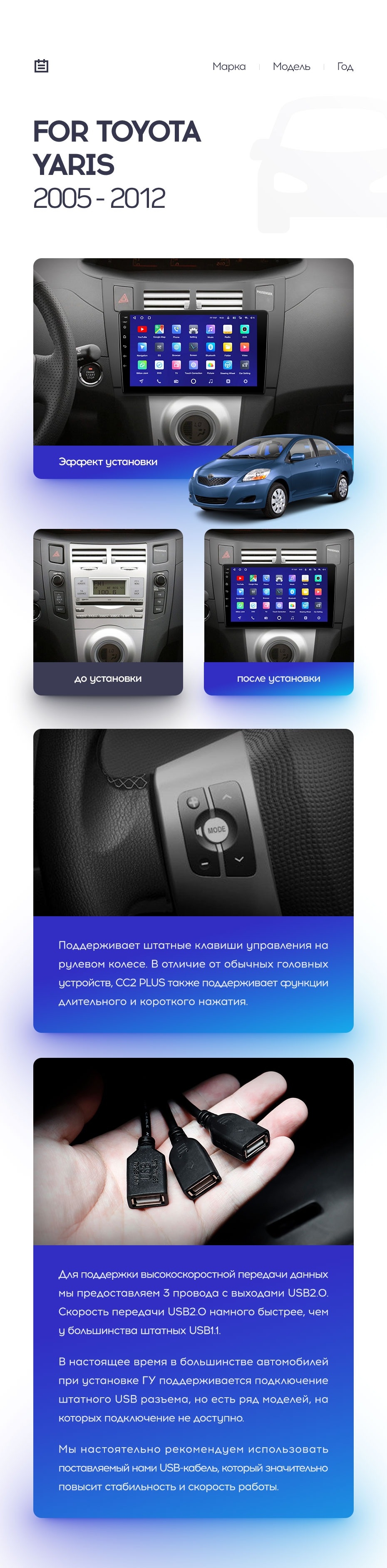 Полный комплект установки магнитолы Teyes с рамкой и проводкой можно выбрать в каталоге штатных магнитол Toyota Yaris XP90 (2005-2012).