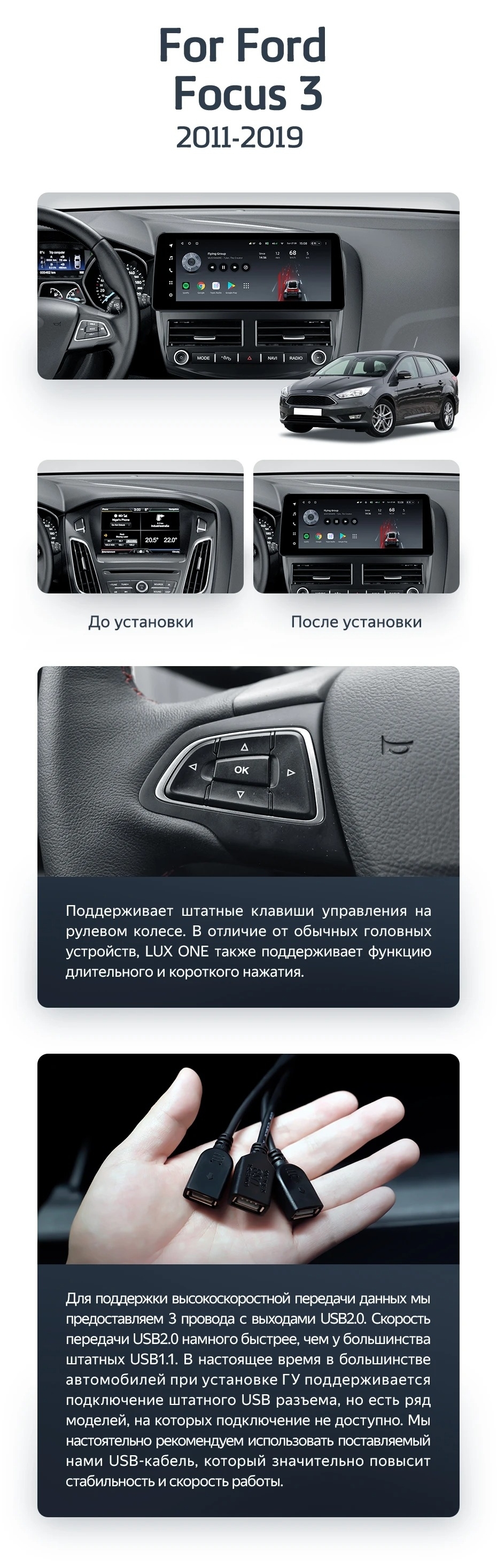 Установочный комплект для Ford Focus 3 Mk 3 (2011-2019) включает переходную рамку и проводку.
