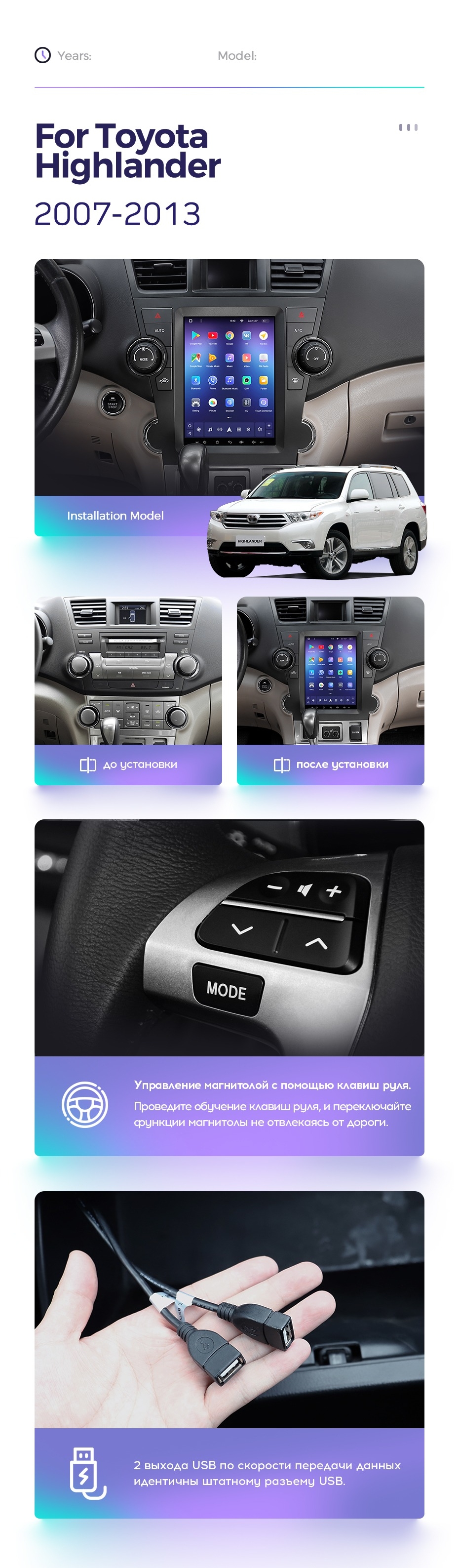 Полный комплект установки магнитолы Teyes с рамкой и проводкой можно выбрать в каталоге штатных магнитол Toyota Highlander 2 XU40 (2007-2013).